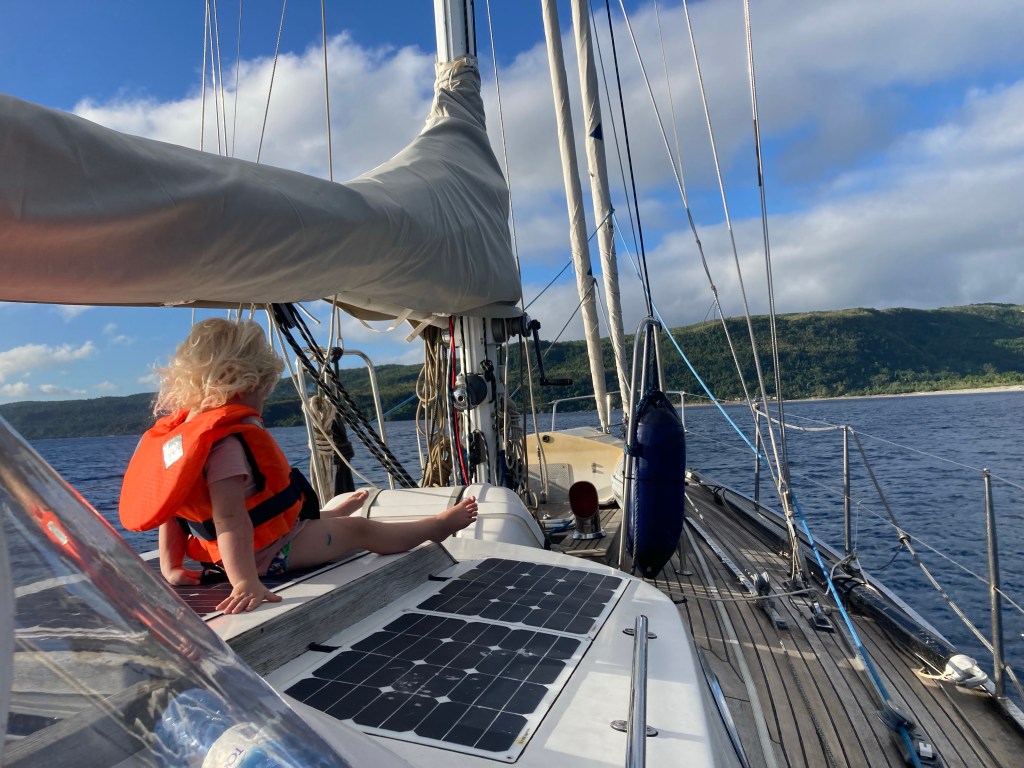 We trekken het derde rif erin en met een puntje uitgeboomde Genua surfen we van de steeds hoger wordende golven. Wat begint met af en toe een natte splash loopt uit tot regelmatig een flinke golf aan water in de kuip. Zoveel water dat zelfs onze inflatable reddingsboei denkt in het water te zijn en ontploft! We zitten veel binnen en schuilen voor het halen van een frisse neus knus met z’n drietjes achter de buiskap. We maken flinke slingers en rollers regelmatig gaat de giek, de gangboorden en zelfs af en toe de raampjes door het water. Luna’s blokken en speelzand vliegen door de boot. De golven worden weer een spelletje en zodra de muziek aan gaat staat Luna te swingen. Met enige uitdaging bakken we samen brood en koekjes.